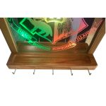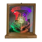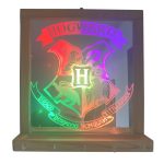 The Hogwarts emblem was engraved into the mirror. The back of the mirror is divided into 5 sections. Each of the sections contain a separate light. This was done to allow each of the houses in Hogwarts it’s own color.